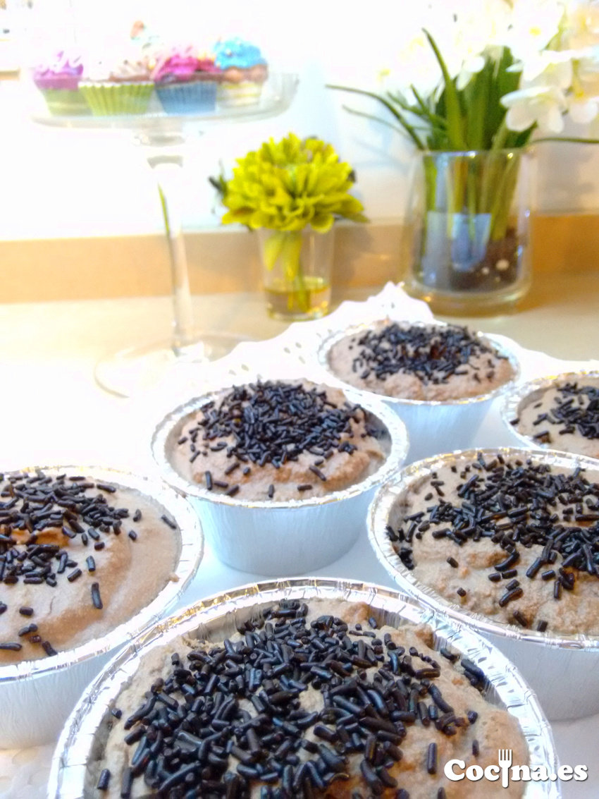 - Cuando está todo perfectamente mezclado, con una cuchara vamos llenando unos vasitos de aluminio (o del tipo que prefiráis), y cubrimos la superficie con fideos de chocolate.