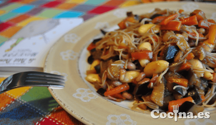 Copio tal cual la descripción que Ricardo hizo en el momento de publicar este plato, pues no tiene desperdicio y además lo dice todo de esta receta para vegetarianos… “fideos chinos con puerro, berenjenas, zanahorias, almendras, lágrimas de granada y salsa de soja”. Creo que con esto está todo dicho sobre ella.